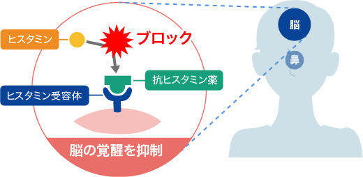 抗ヒスタミン薬が、ヒスタミンとヒスタミン受容体の結合をブロック。脳の覚醒が抑制され、集中力・判断力の低下に。