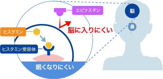 エピナスチン塩酸塩は脳に入りにくいので、ヒスタミンとヒスタミン受容体の結合を妨げない。