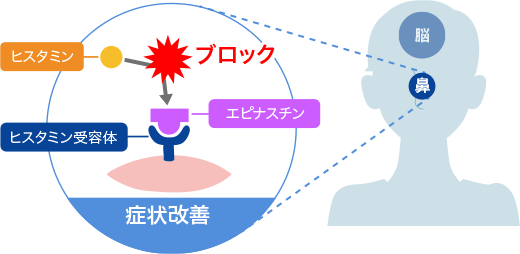 アレジオンの有効成分エピナスチン塩酸塩は、脳に入りにくい性質を持った第2世代抗ヒスタミン薬。そのため、脳内ではヒスタミンの働きをほとんど妨げないので、眠気を生じにくく、鼻粘膜では受容体としっかり結合して、ヒスタミンと受容体の結合をブロックします。