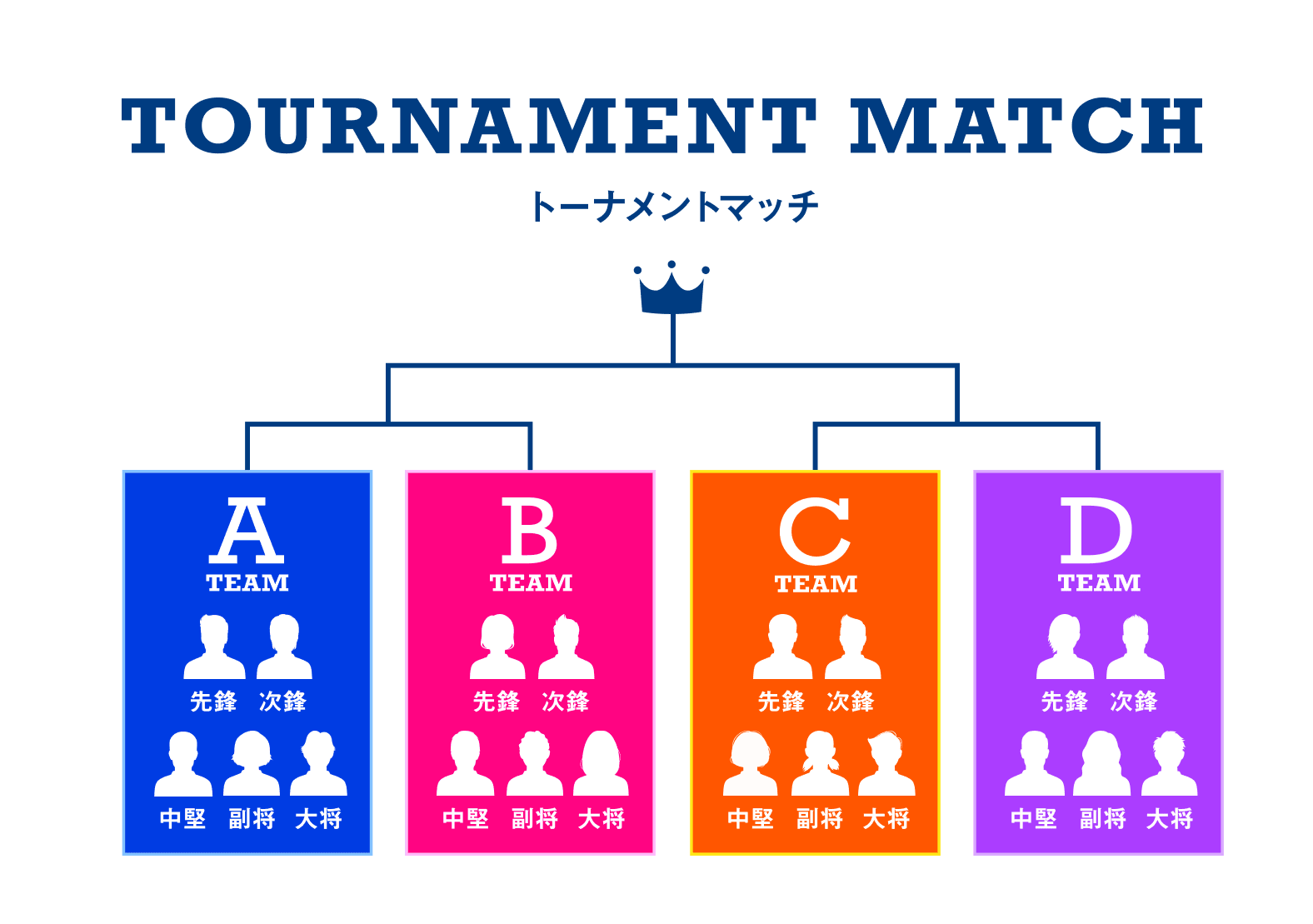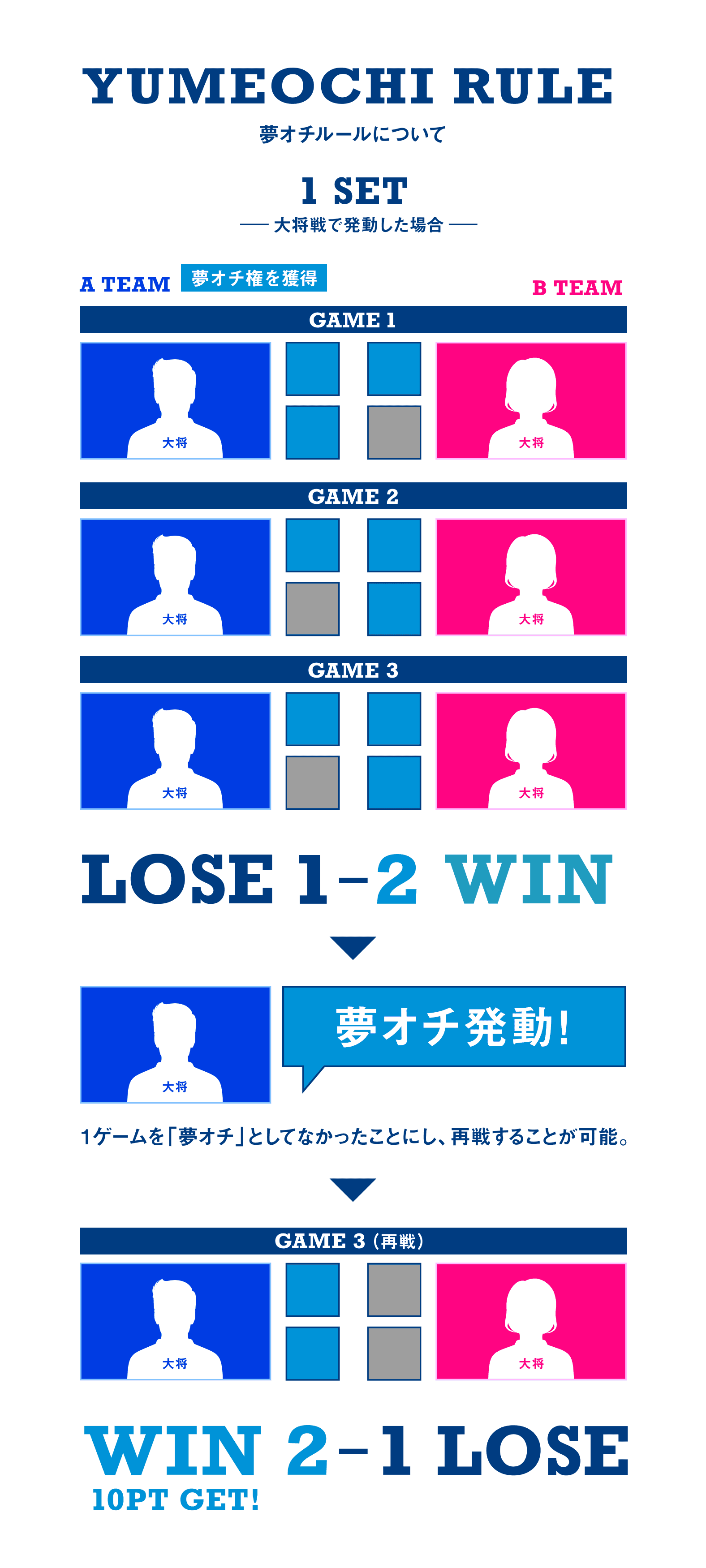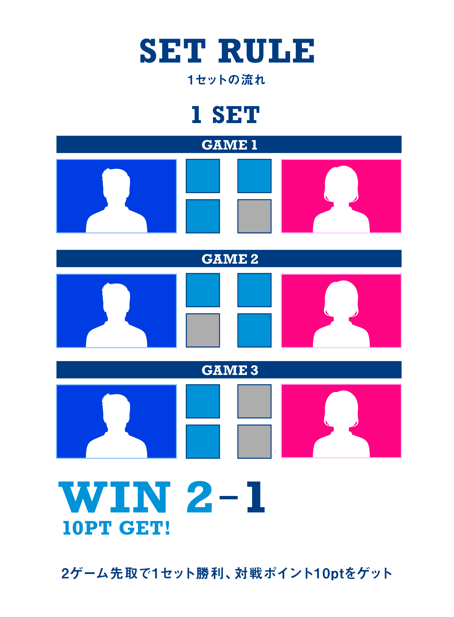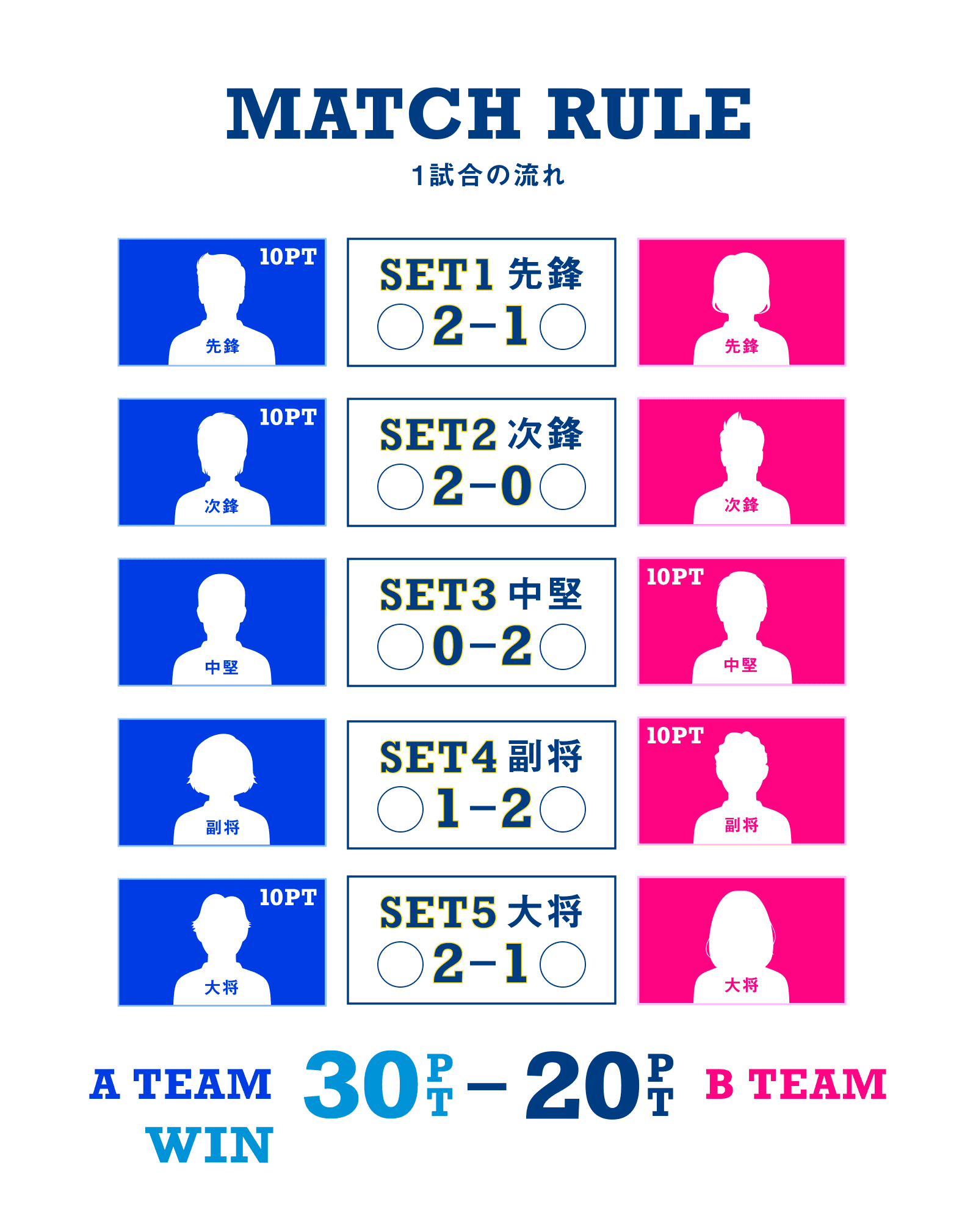 各対戦は「BO3」=「最大3ゲームの2ゲーム先取」で、勝者は対戦ポイント10ptを獲得します。各チームの先鋒、次鋒、中堅、副将、大将同士がそれぞれ対戦し、計5セットの対戦が行われます。