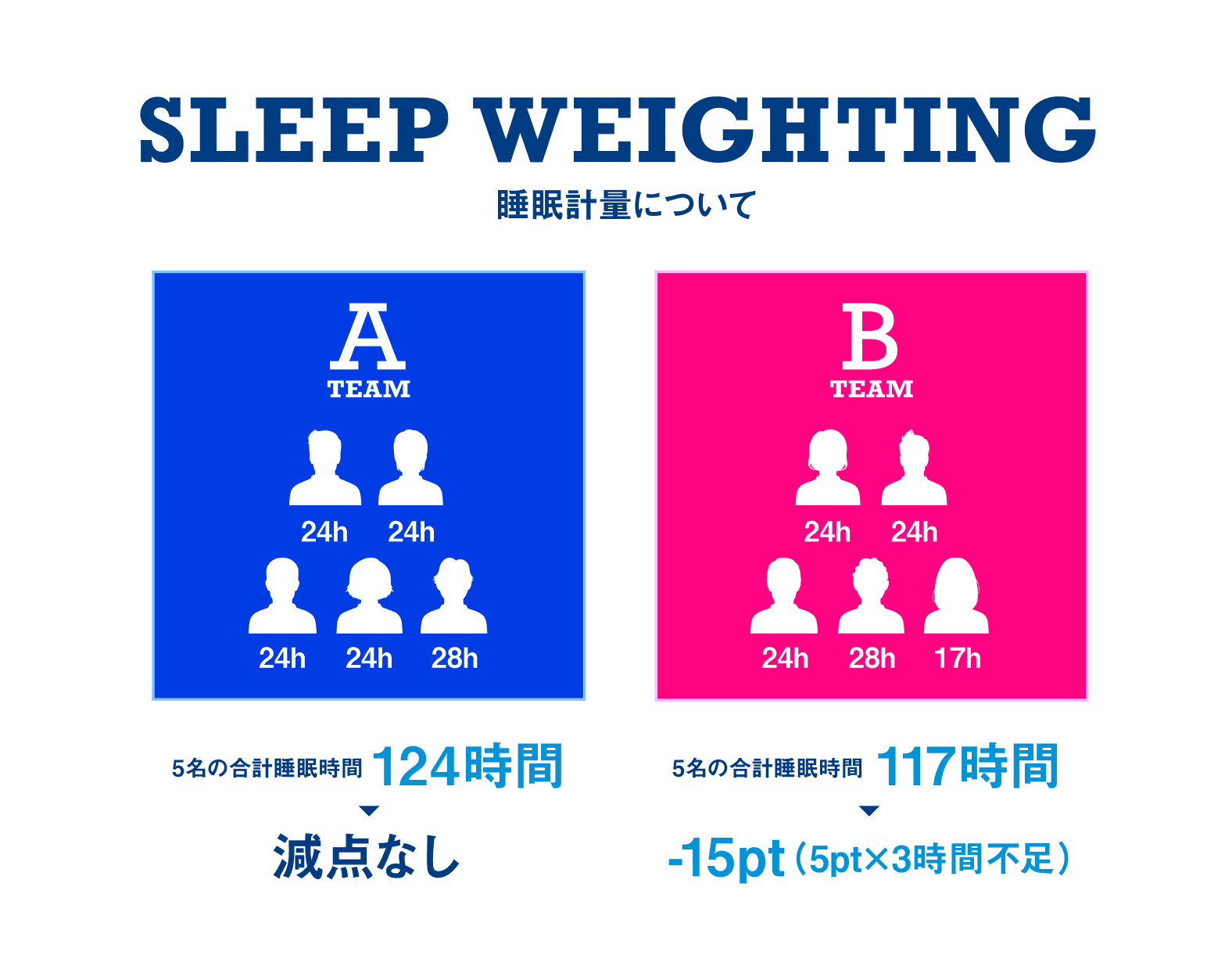 出場者には6月30日就寝時~7月4日起床時までの計4回の計量で、各回6時間以上の睡眠を取っていただきます。1人あたり、6時間×4回計量=24時間以上、1チーム合計で24時間×5人=120時間以上が基準となります。それに満たない場合、不足分1時間までにつき5ポイント減点とします。