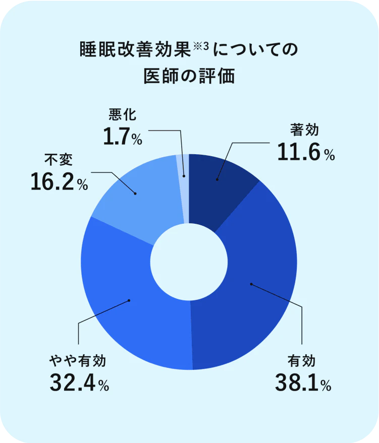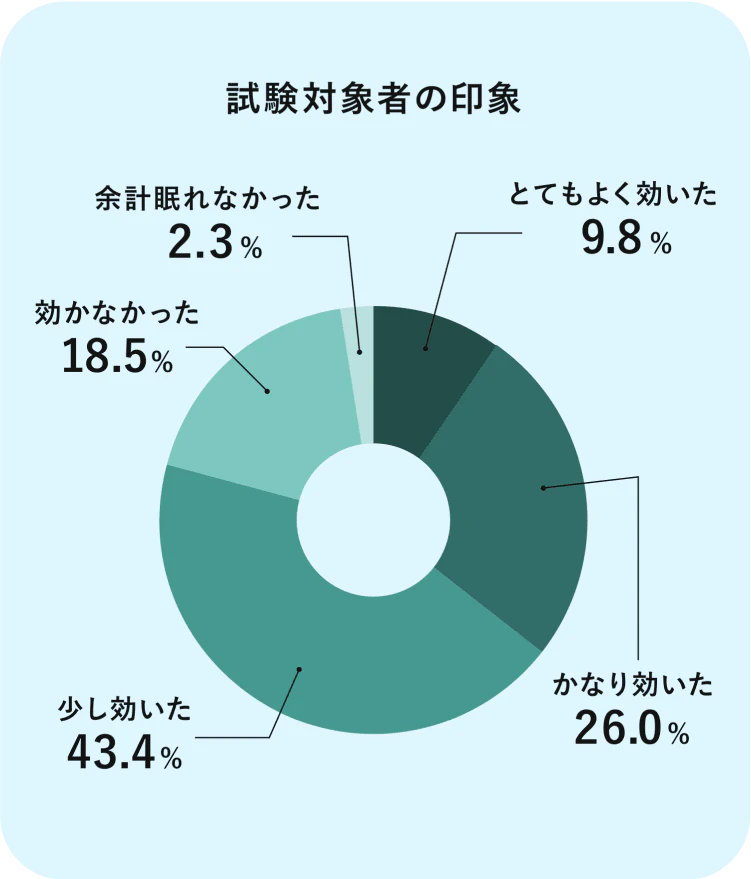 有効性を確認するため、「寝つきが悪い」「眠りが浅い」などの症状を訴える方を対象に、臨床試験を実施しています。その結果、睡眠改善効果82.1%※1という医師の評価が得られました。また、試験対象者ご自身による印象についても、79.2%※2の方々が効果を実感されました。このように、臨床的に睡眠改善効果が得られたことにより、一時的な不眠に有効であることが示されています。