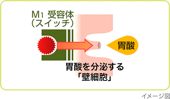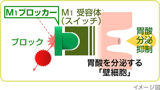 M1ブロッカーが、この胃酸分泌を促進するスイッチである「M1受容体」をブロックし、過剰な胃酸の分泌を抑制します。