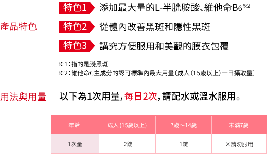 主要成分L-半胱胺酸有助於皮膚代謝(代謝循環),排出過多的黑色素。