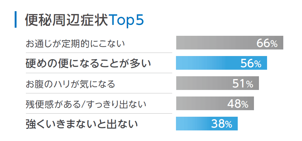 また、便秘の周辺症状の上位には、「硬めの便になることが多い」や、硬めの便に関わる「強くいきまないと出ない」という項目があがっています。