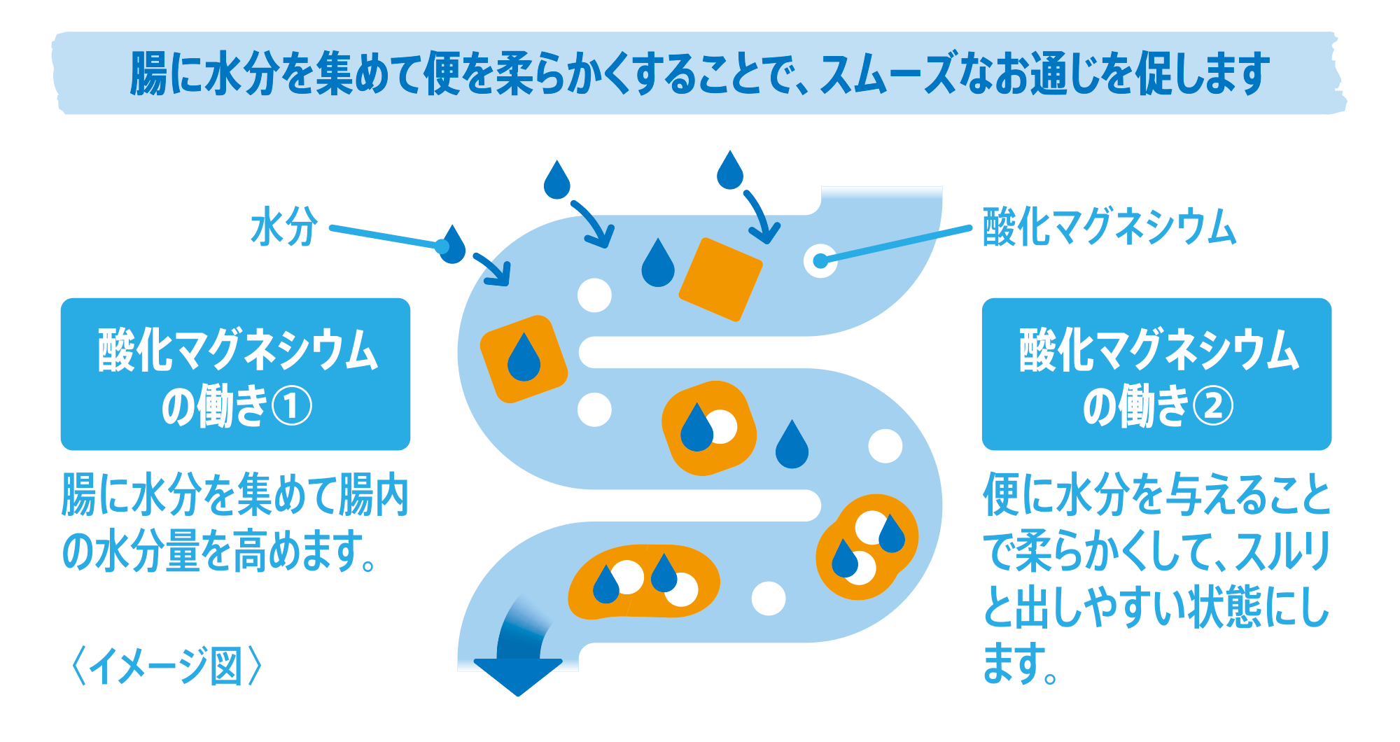 酸化マグネシウムは、腸内に水分を集める働きがあります。この働きに着目し、硬めの便を水分で柔らかくし、出しやすくして自然に近いお通じを促します。