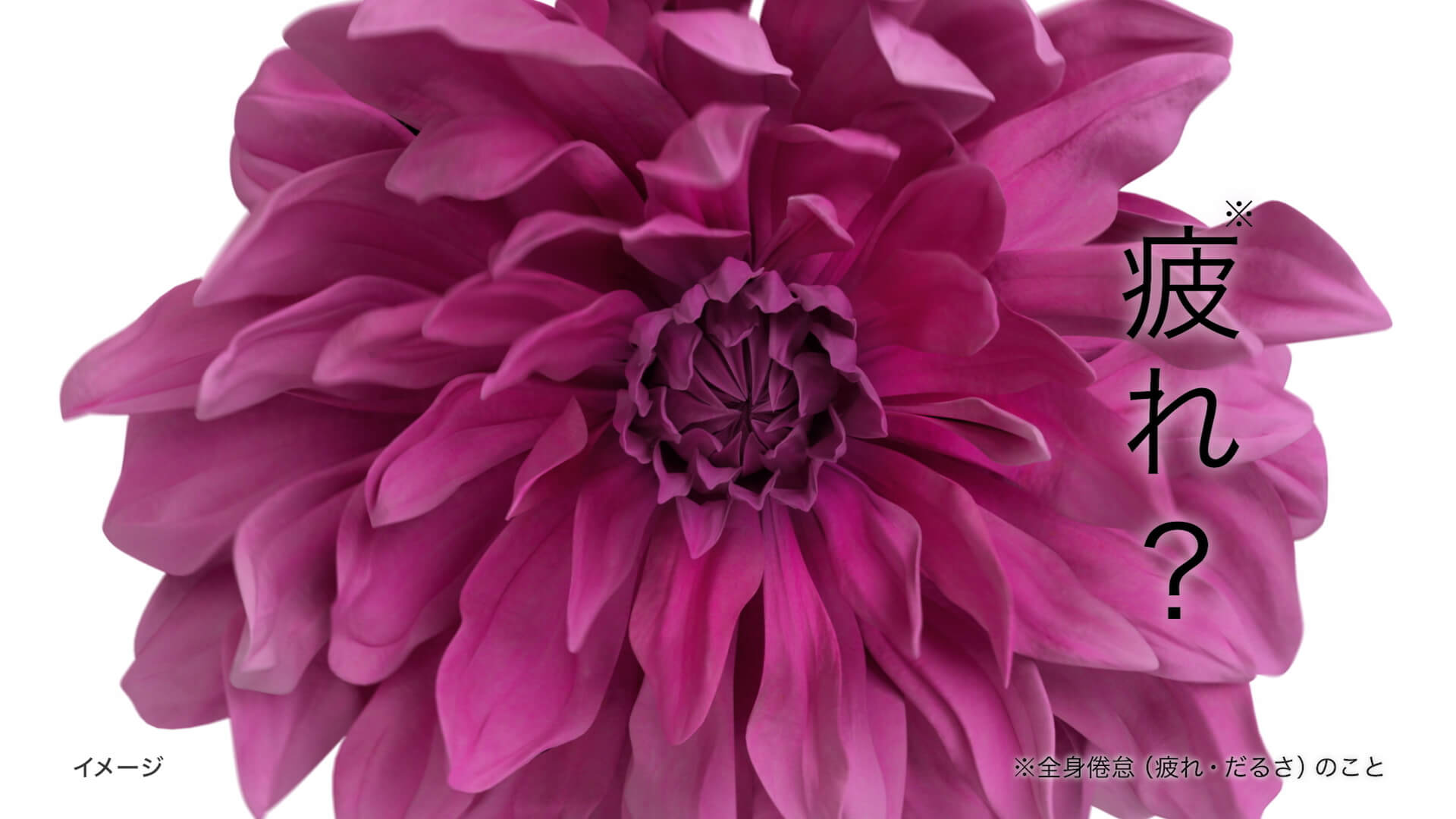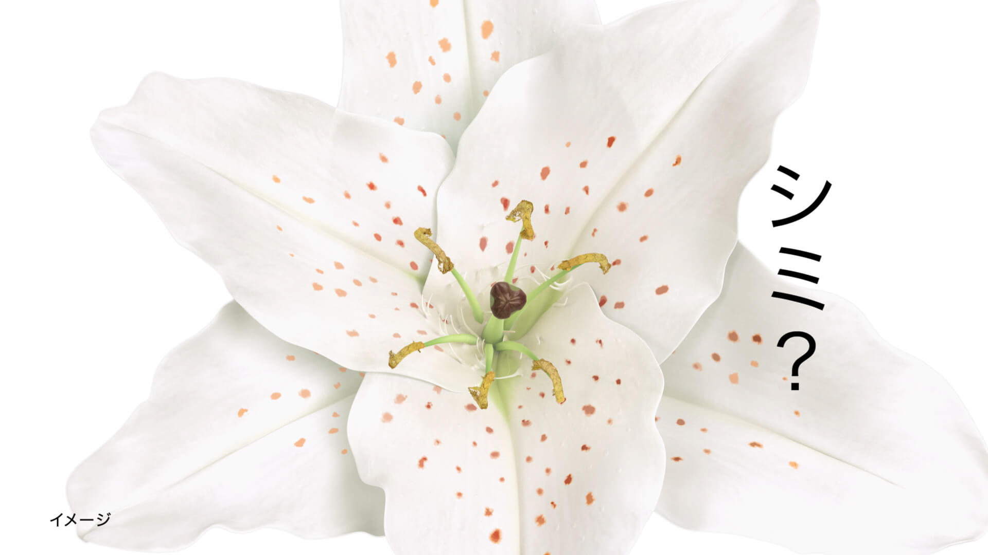問いかけと同時に、華やかに咲いていた花は、悩みであるシミをイメージした「斑点ができていくユリの花」、疲れをイメージした「元気のなくなっていくダリア」へと変化していきます。