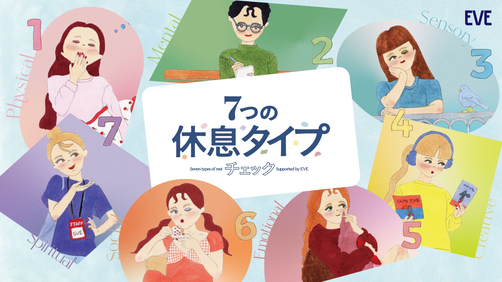 EVE(イブ)がこの度ご紹介する「7つの休息タイプチェック」は、一人ひとりに合った7つの休息方法を、自宅派、外出派に分けた14パターンから導き出し、休息方法を見直していただくためのコンテンツとなっています。休息に関する研究とベストセラーとなった著書で世界的に有名なサンドラ・ダルトン=スミス氏の「7つの休息タイプ」をベースに、EVE(イブ)独自のチェックシートを作成し、世界的に活躍するイラスレーターのChiMyさんによるイラストで分かりやすく表現しました。