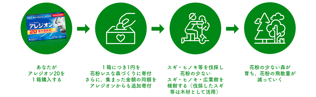 花粉などによるアレルギー性鼻炎にお悩みのお客様がアレジオン20を購入いただくと、売り上げの一部から1箱につき1円を花粉レスな森づくりの活動費に寄付されます。さらに、集まった金額と同額をアレジオンからも追加で寄付いたします。集まった寄付金で花粉を多く出すスギ・ヒノキを伐採して、花粉の少ないスギ・ヒノキ・広葉樹を植樹します。また、伐採したスギ等は木材などに活用されます。こうして花粉の飛散量を減らして花粉レスな森づくりを目指し、アレジオンは日本の花粉症問題解決に取り組んでいきます。
