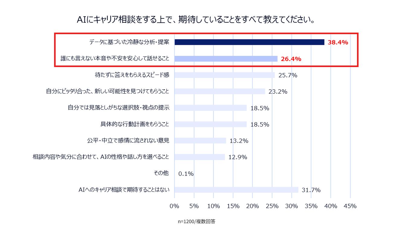 AIにキャリア相談をする上で期待していることとして、最も高いのは「データに基づいた冷静な分析(38.4%)」、次いで「安心して話せる(26.4%)」という結果に。AIには「客観的な判断材料」だけでなく、「心理的な安全性」も同時に求められており、単なる情報検索以上のパートナー関係を望んでいることがわかります。