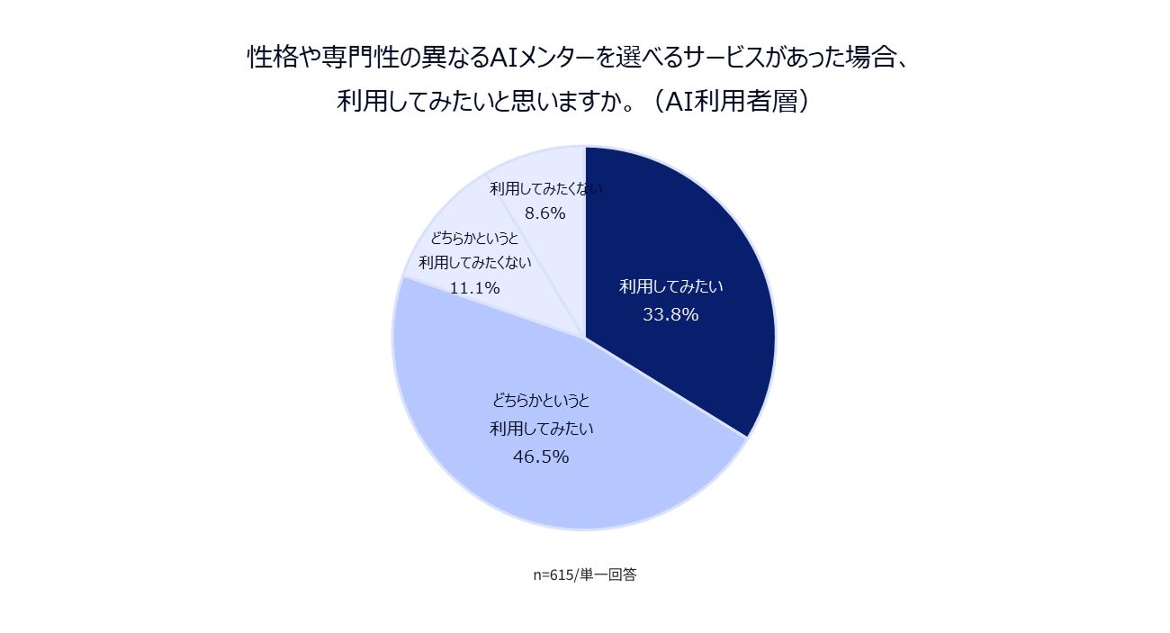 さらに、「性格や専門性の異なるAIメンターを選べるサービスがあった場合、利用してみたいと思いますか」という質問に対して、普段からAIを利用している人の8割が「利用してみたい(33.8%)」「どちらかというと利用してみたい(46.5%)」と回答。AIを使う習慣がある層ほど、より自分にあったAIを求めていることが明らかになりました。