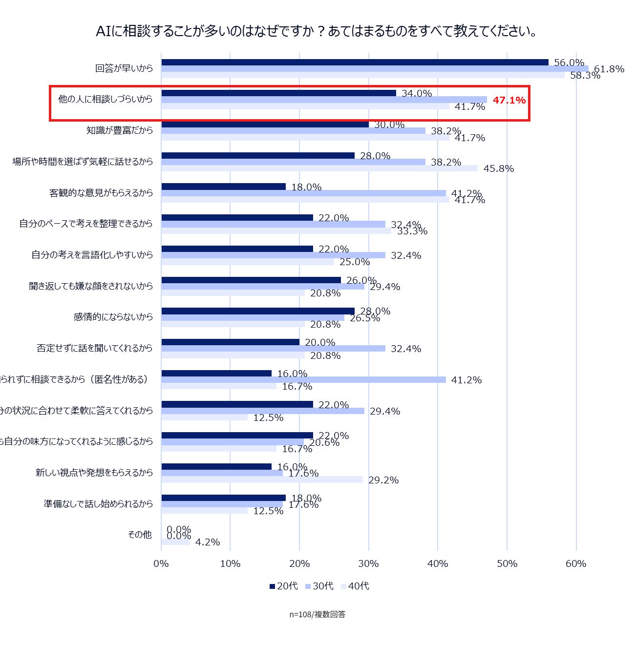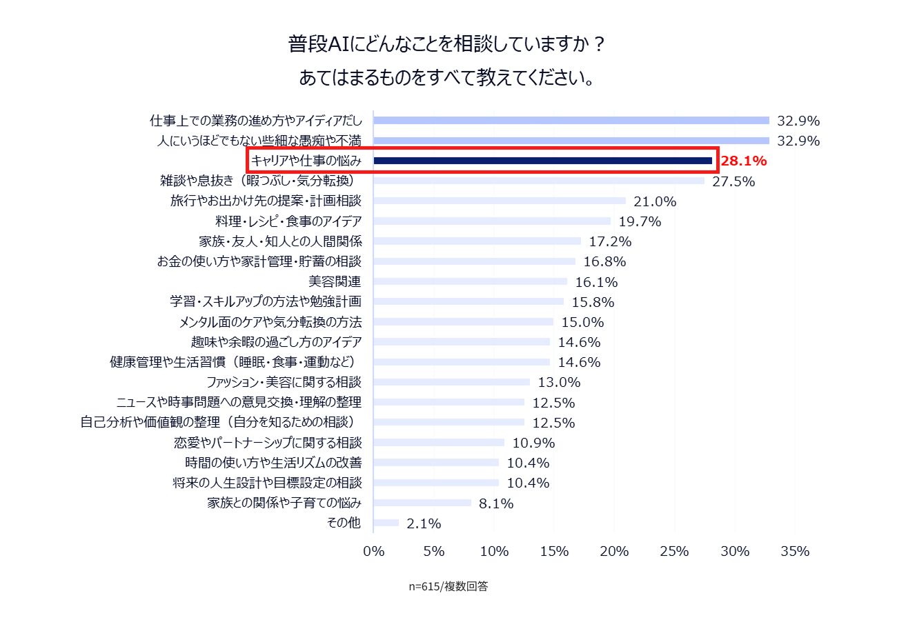 その相談内容については、「人にいうほどでもない些細な愚痴や不満(32.8%)」「業務上のアイディア出し(32.8%)」に次ぎ、「キャリアや仕事の悩み(28.1%)」に回答が集まりました。AIに相談する理由としては、「ほかの人に相談しづらい」という回答が20〜30代で多く、特に30代では約半数(47.0%)に達しています。人間関係のしがらみがないAIが相談の受け皿になっていることが推測されます。