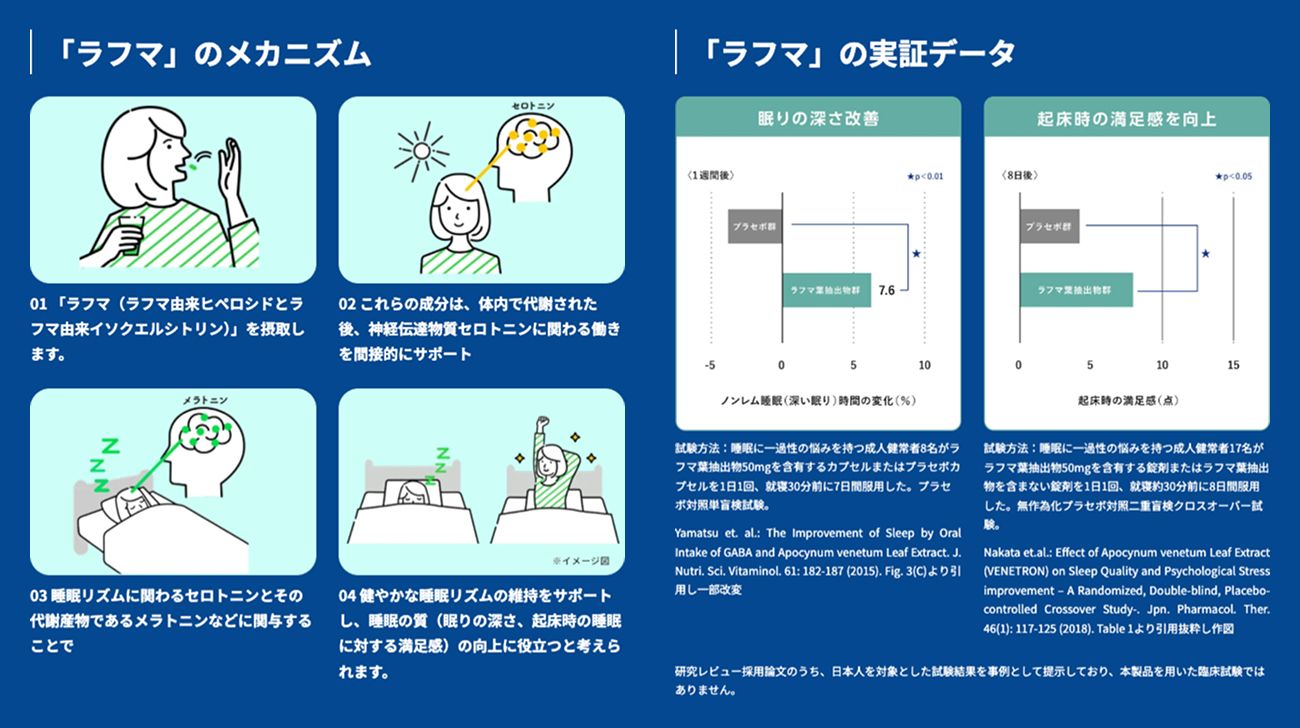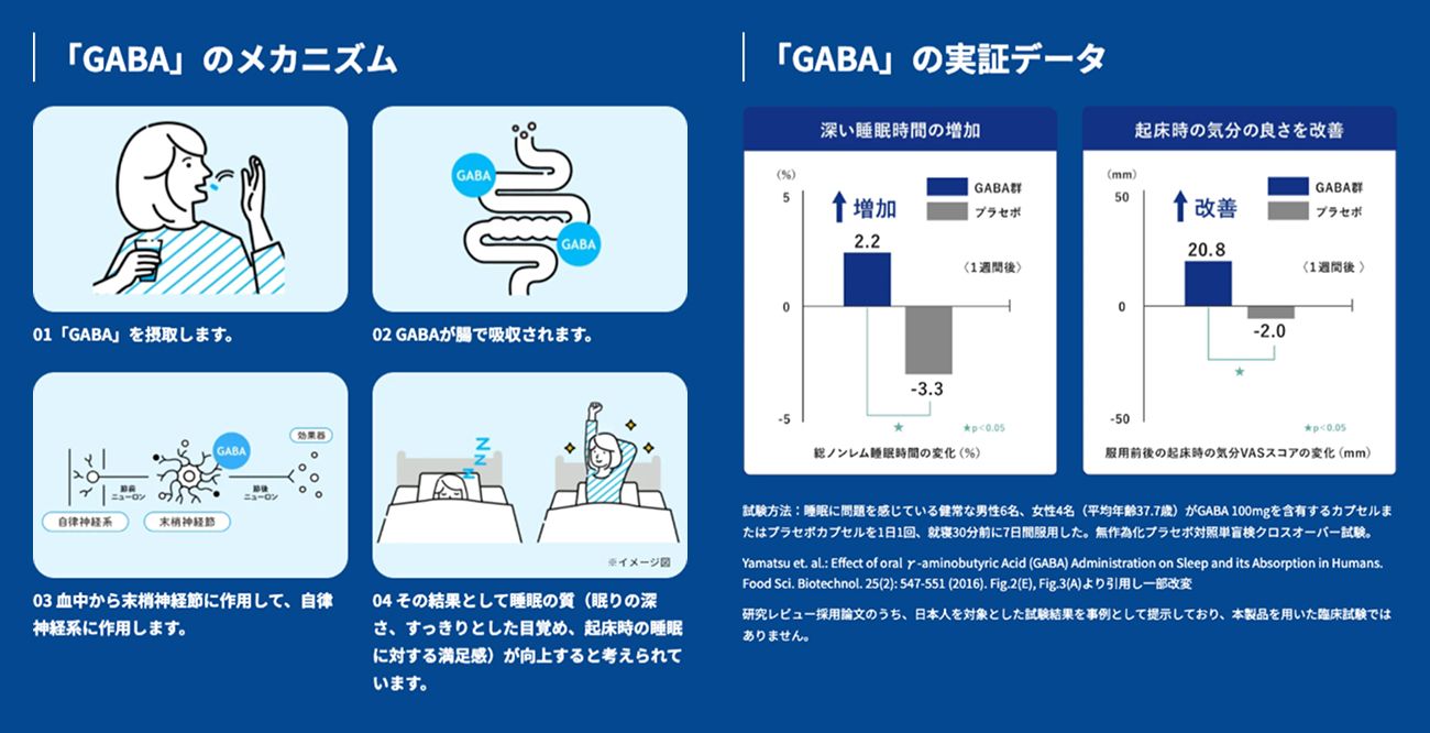 機能性表示:本品にはGABAとラフマ由来ヒペロシド、ラフマ由来イソクエルシトリンが含まれています。GABAには睡眠の質(眠りの深さ、すっきりとした目覚め)の向上に役立つ機能、日常生活で生じる一時的な活気・活力感の低下を軽減する機能があることが報告されています。ラフマ由来ヒペロシド、ラフマ由来イソクエルシトリンには睡眠の質(眠りの深さ・起床時の睡眠に対する満足感)の向上に役立つ機能があることが報告されています。