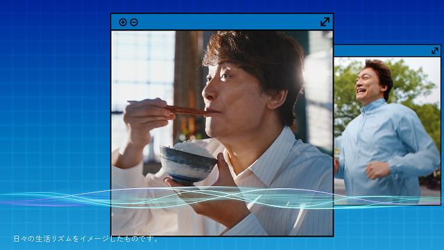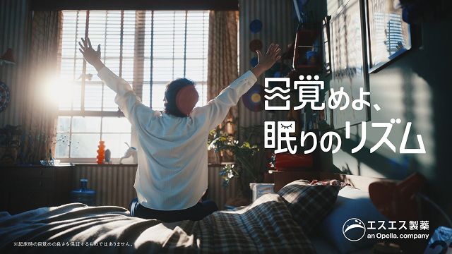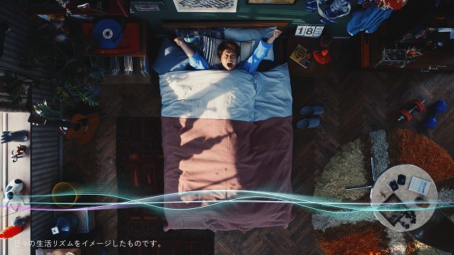 CMは、ベッドに横たわる香取さんが、枕元のスタンドライトを消すシーンからスタートします。暗くなったベッドの上で、香取さんはぐっすりと眠りの中へ。毎日の生活リズムを象徴する波が浮かび上がり、時間の経過とともに、暗かった空間に朝の光が差し込んでいきます。続いて、波形に合わせるように、朝食、ランニング、ステージといった日常のシーンがテンポよく展開。良い眠りを大切にすることで、心地よく過ごす毎日のイメージを表現しています。後半では商品カットを通して、ダブルの成分が睡眠の質・眠りの深さの向上に役立つことを訴求。最後は、朝のベッドの上で伸びをする香取さんの姿とともに、「目覚めよ、眠りのリズム」というメッセージで締めくくります。