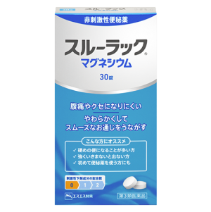 「スルーラックマグネシウム」は酸化マグネシウムを有効成分とした非刺激性便秘薬です。酸化マグネシウムの働きにより、腸に水分を集めて便をやわらかくすることで、スムーズなお通じを促します。刺激性便秘薬が腸を直接刺激するのに対して、「スルーラックマグネシウム」は腸を直接刺激しない成分なので、お腹が痛くなりにくく、繰り返し服用してもクセになりにくいのが特長です。そのため、これまで便秘薬を敬遠されていた方や初めて使用する方にもおすすめの便秘薬です。