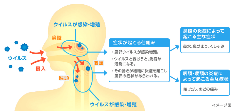 その働きが組織に炎症を起こすことで、風邪の症状があらわれます。