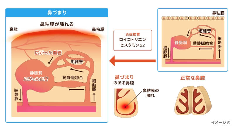 鼻粘膜の腫れが鼻づまりを引き起こす